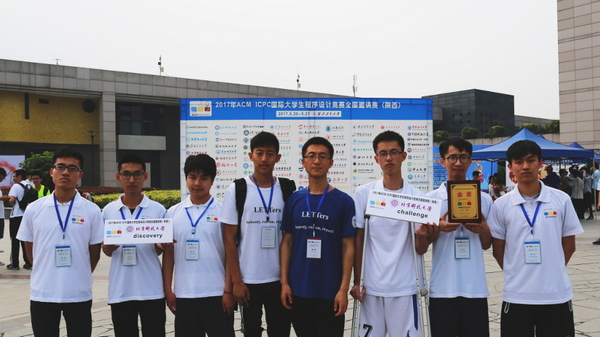 的13级学生殷斌一和袁兆麟担任助理教练。两支参赛队伍分别由物联1401班李志远、安全1402班徐经纬、计算机1502班陈笑天(challenge)和信安1502班简川杰、计算机1504班张清瑜、计算机1604班孙洪武(discovery)组成,其中discovery的三名队员都是第一次参加全国性的ACM-ICPC竞赛。比赛于5月21日上午9:00开始,共11题,限时5小时。challenge队员积极思考、密切配合,成功解出8题,最终获得本次比赛的金奖。challenge和discovery还将参加今年ACM-ICPC亚洲区域赛的各站比赛。