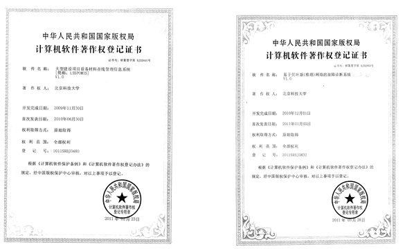 大型建设项目设备材料在线管理信息系统(授权号:2011SRBJ0480) | 基于贝叶斯(推理)网络的故障诊断系统 (授权号: 2011SRBJ0832) |