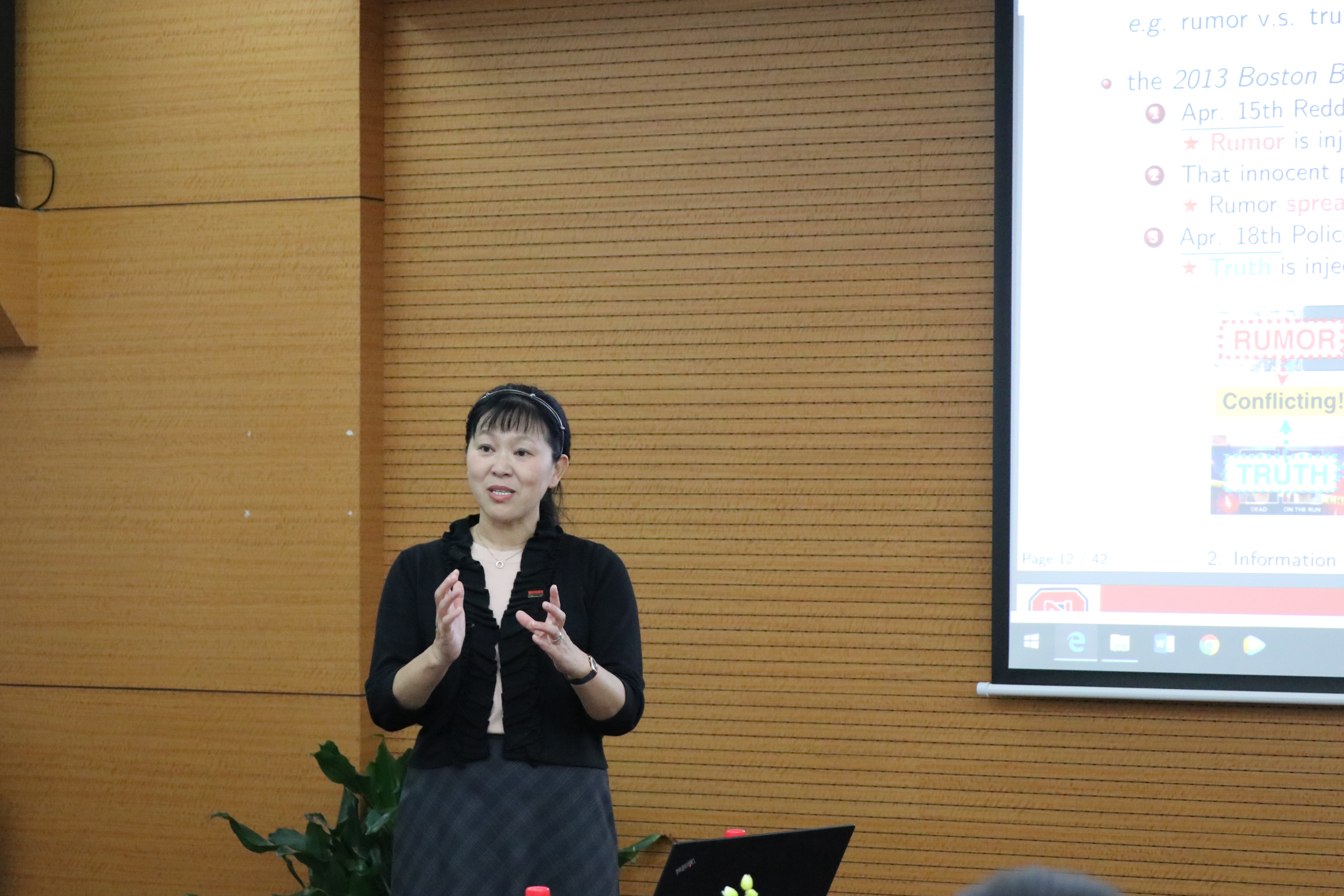 讲座开始,王文野教授生动简要地向大家介绍了自己关于信息时代独特的观点。接下来,王教授从通信技术的建立讲起,一直讲到物联网框架下大数据的产生。她将信息技术发展史上的重要事件按照时间顺序串起来,向同学们展示出一个清晰完整的发展链条。王教授详细介绍了如何将社交网络的信息传播建模,如何分析信息进化和传播的定量指标,如何将病毒传播模型应用到单跳和多跳无线网络中,同学们表示讲座内容充实、观点新颖、思路清晰、气氛融洽,收获颇丰。