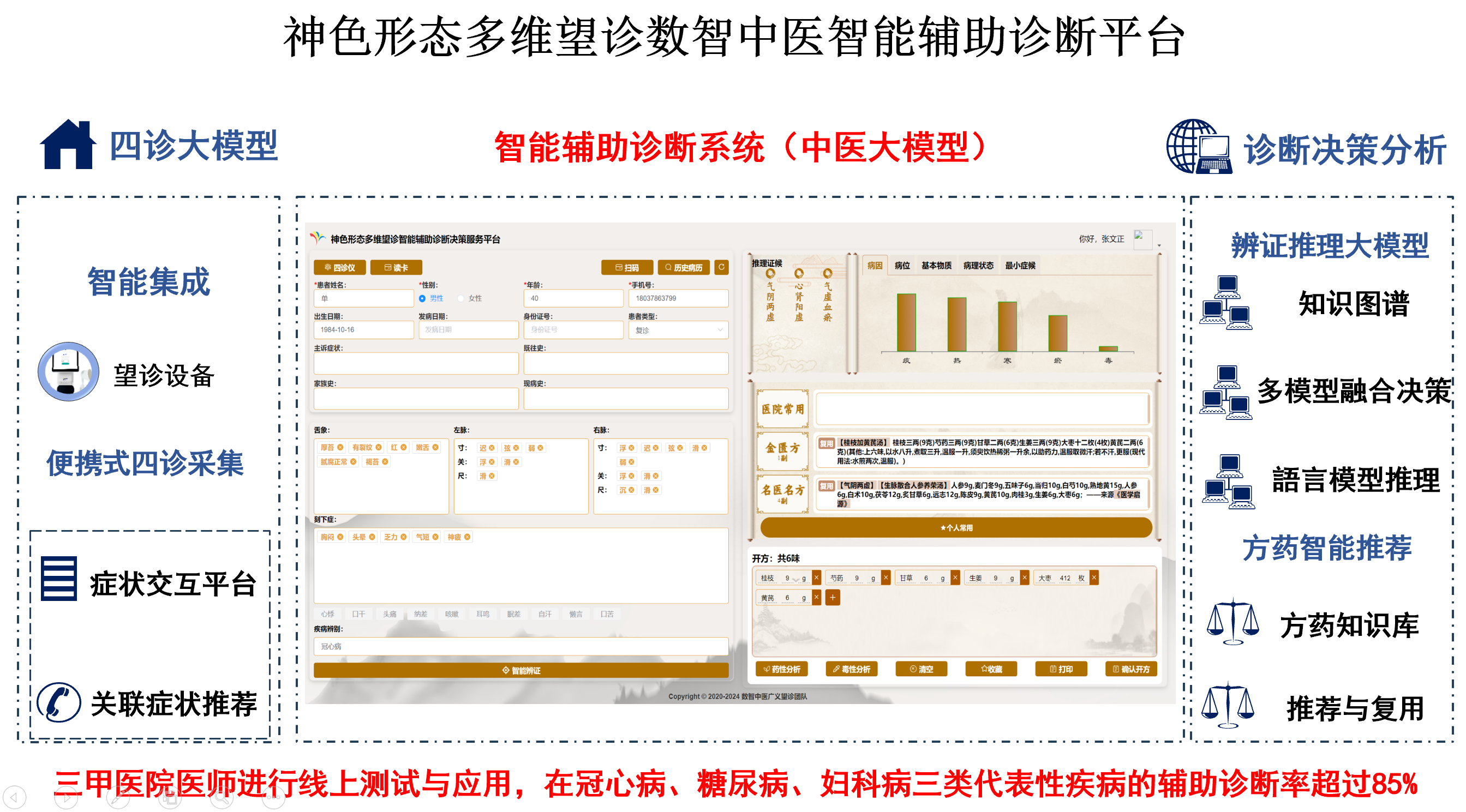 以中医辨证论治为核心,融合自然语言处理、知识图谱与检索技术,构建覆盖“病-证-方-药”全链条的智能化决策支持平台。该系统以张仲景的学术思想为理论基础。构建跨时代、多源异构的中医药知识库,采用领域自适应预训练技术构建张仲景中医药大模型。基于“四诊信息→证候归纳→治则生成→方药推荐”辨证论治思想,通过指令微调和强化学习赋能中医药大模型决策能力,使模型能够模拟临床思维。系统实现了多维广义望诊中医症状采集、辨证辨机、证素推荐、方药推荐、方药分析、知识推荐等;同时引入大模型的生成式推理能力,提供全流程诊疗服务。系统结合多模态广义望诊大模型,实现全科、专科、专病以及名医经验Agent的自动化构建。