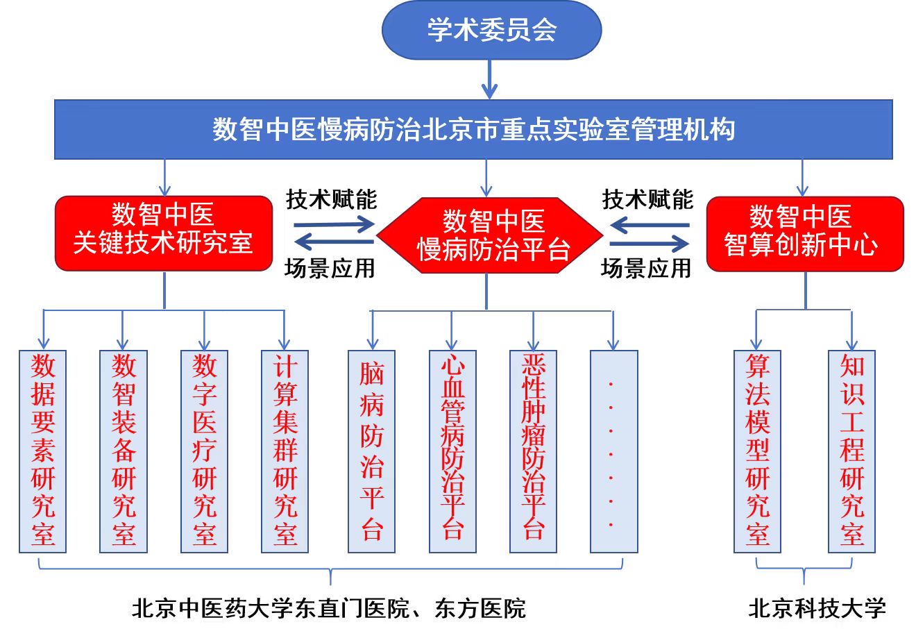 数智中医慢病防治北京市重点实验室以北京中医药大学东直门医院为依托单位,北京中医药大学东方医院、探花视频 整合各自优势联合共建,由刘金民教授担任实验室主任、商洪才研究员与胡凯文教授担任执行主任。聚焦心脑血管病、肿瘤等重大慢病防治领域,围绕“数据筑基 智慧引航”的数智中医发展理念,开展数智中医慢病防治关键技术攻关与中医药精准诊疗应用示范研究。实验室创新人才培养机制,汇聚中医药学、数据科学、循证医学、计算机科学等多科学骨干人才,集智创新,形成了以中医药为主体多学科交叉的创新团队。